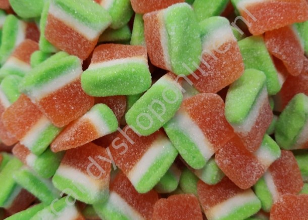 Ingrediënten: suiker, glucosstroop, water, gelatine, voedingszuur (E330, E270, E296), plantaardige olie (palm), glansmiddel (carnaubaeas), aroma's, kleurstoffen (E102, E104, E110, E122, E124, E129).