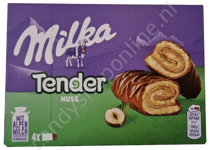 Milka Tender milch, zachte cakejes met fijne melkcremevulling omhuld met melkchocolade.