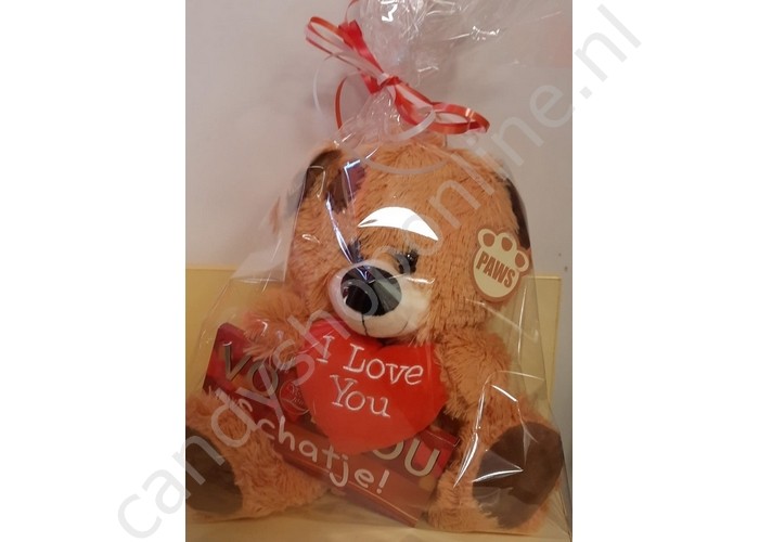 Pluche Beer Bruin met Hart 27 cm. met Chocolade Tablet Schatje